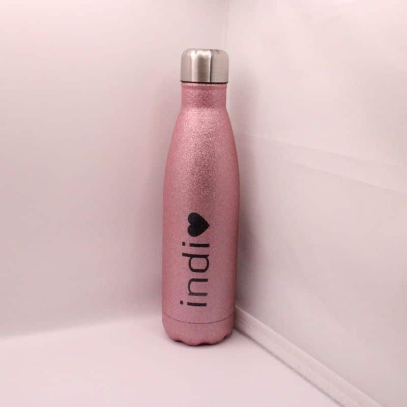 Super leuke stijlvolle glitter drinkfles van 500 ml. De fles is verkrijgbaar in 3 sprankelende kleuren en kan gepersonaliseerd worden met een naam.