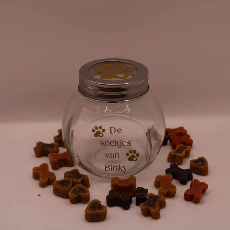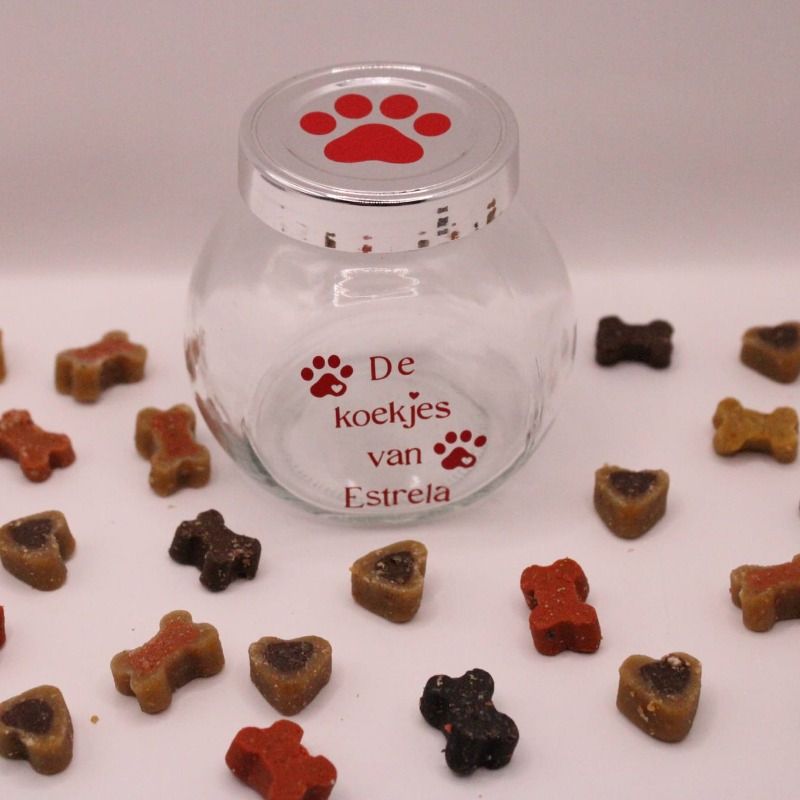 Verras jouw huisdier of zijn baasje met dit leuke glazen potje, wat je kunt vullen met de koekjes of snoepjes van jouw huisdier. Op het potje komt de naam van jouw huisdier of een korte tekst. Een leuk cadeautje voor dierenliefhebbers of als leuk cadeautje bij een nieuw huisdier of dierendag.