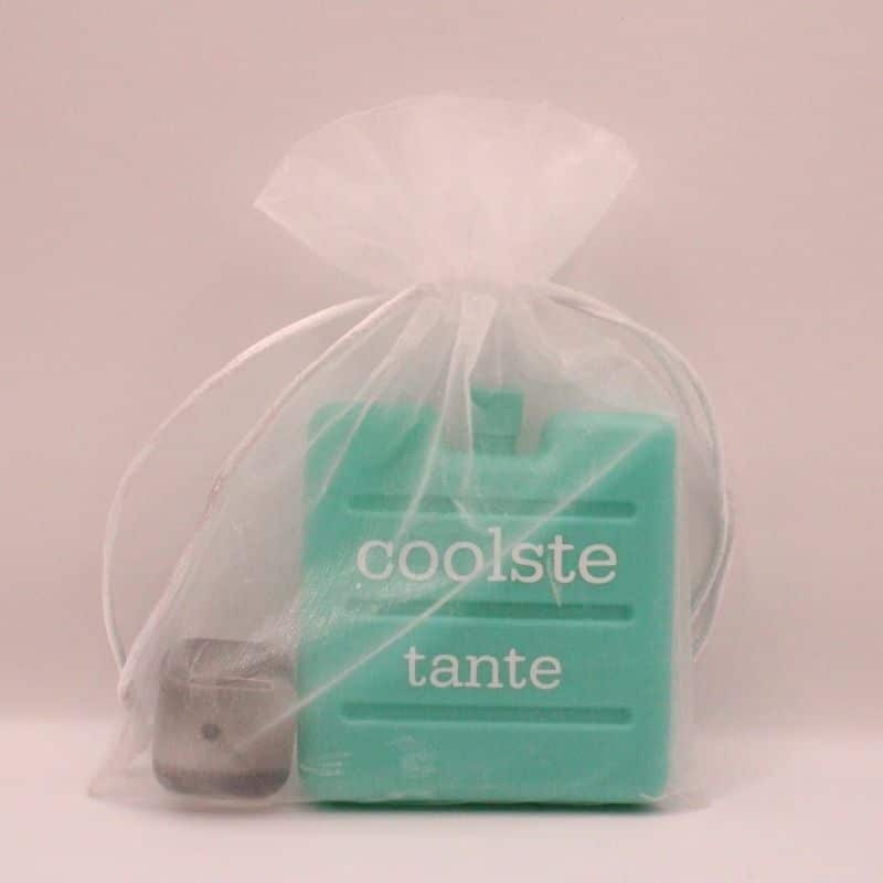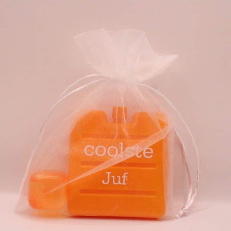 Dit kleine koelelement is super handig, licht gewicht en compact voor onderweg. Het koelelement word gepersonaliseerd met een naam of kleine tekst, en verpakt in een grijs of wit organza zakje.